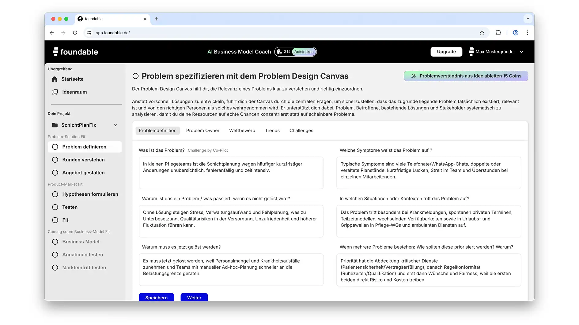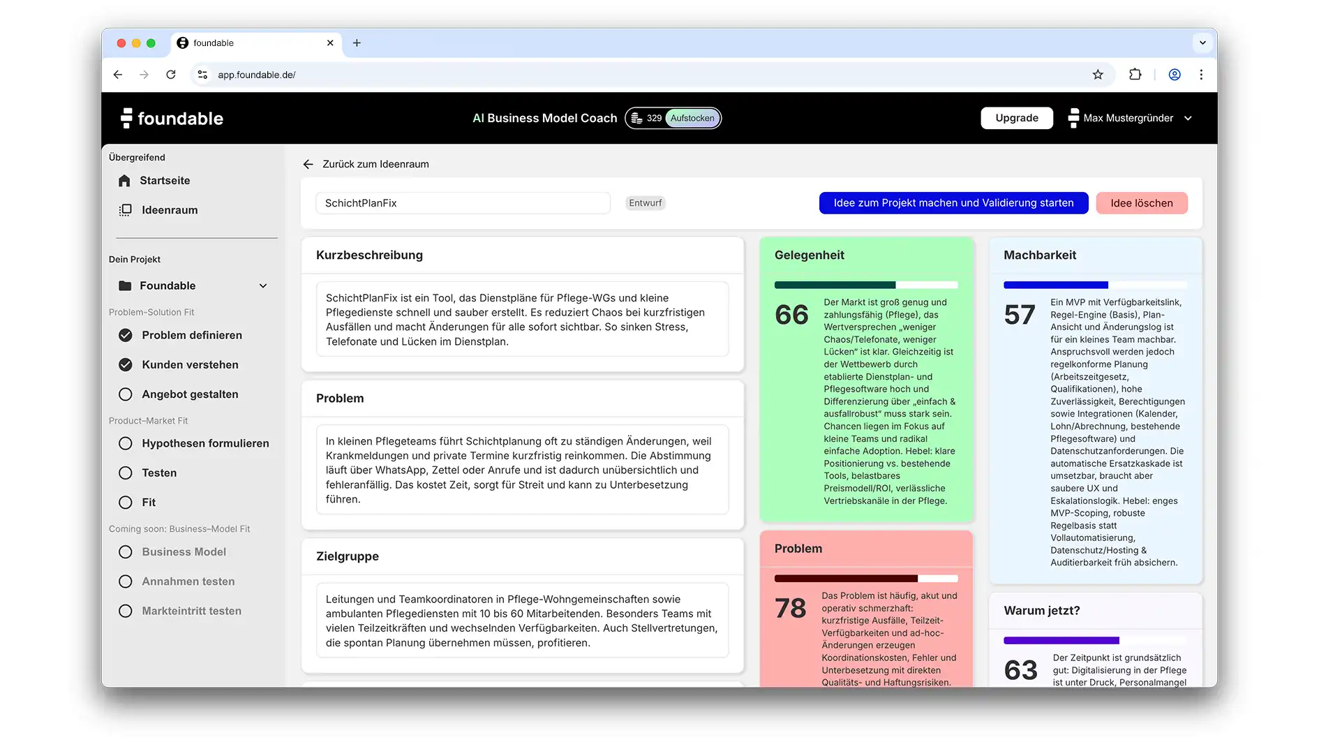 Generiere neue Geschäftsideen oder bringe bestehende Gedanken in eine klare Struktur. Foundable hilft dir, Ideen einzuordnen, zu bewerten und gezielt weiterzuentwickeln statt im Bauchgefühl zu bleiben.