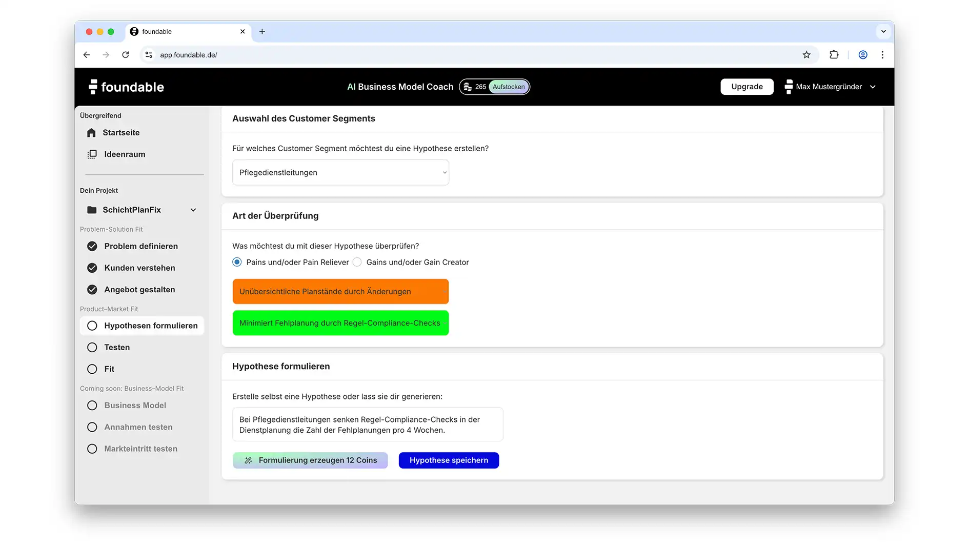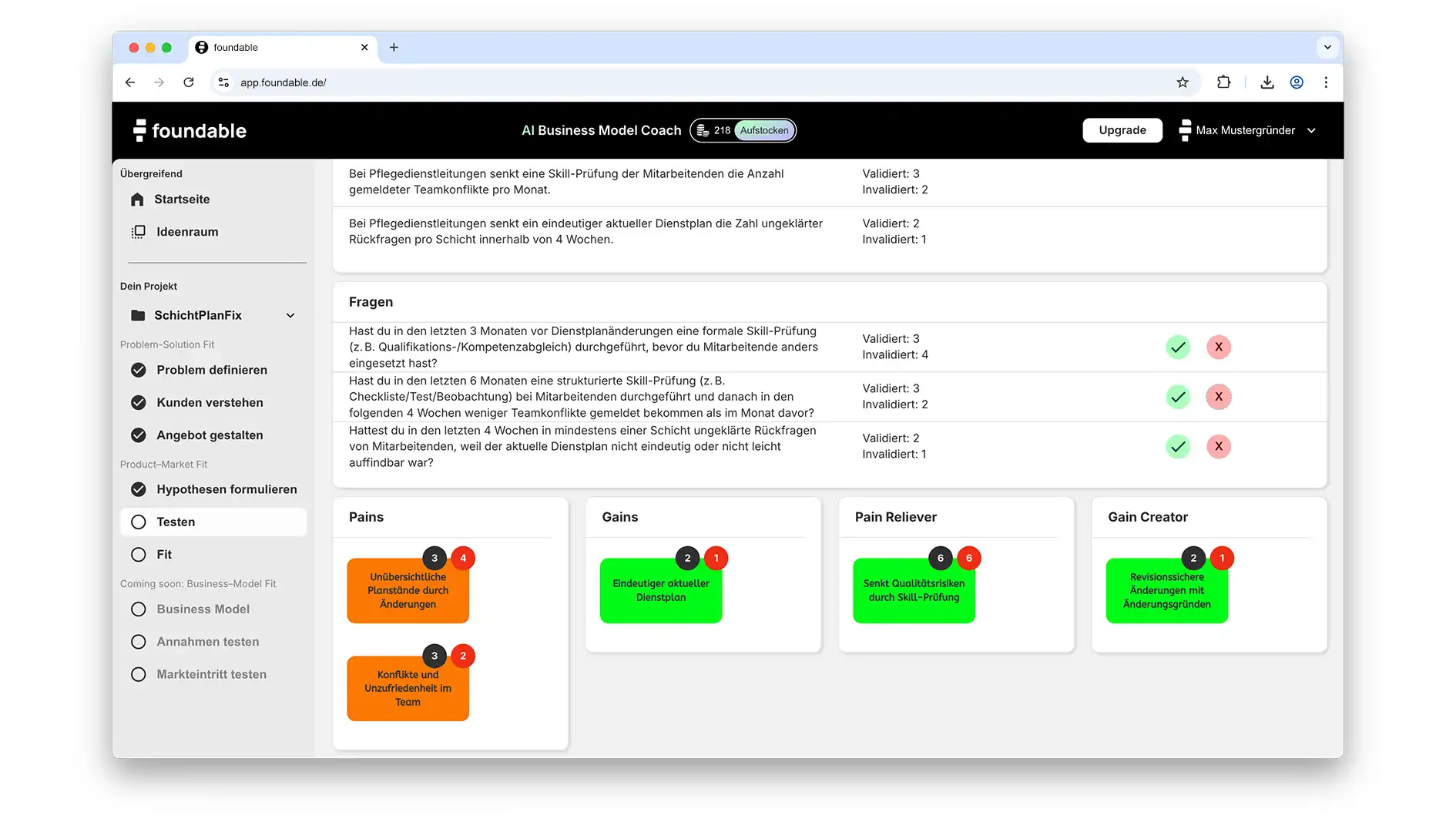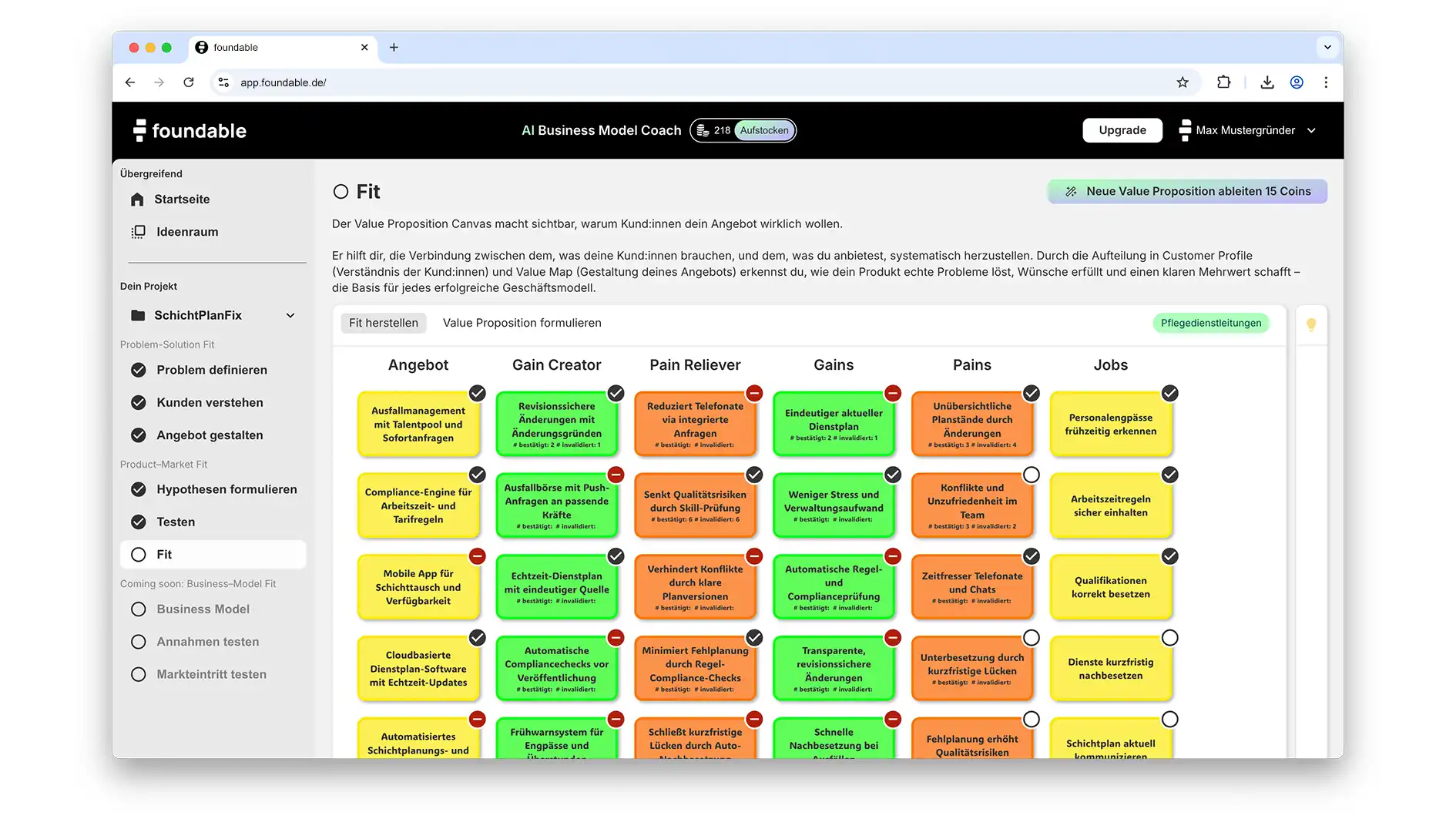 Führe alle Erkenntnisse zusammen und sieh auf einen Blick, welche Value Propositions tragen. Foundable macht sichtbar, wo Problem, Lösung und Kunde wirklich zusammenpassen.