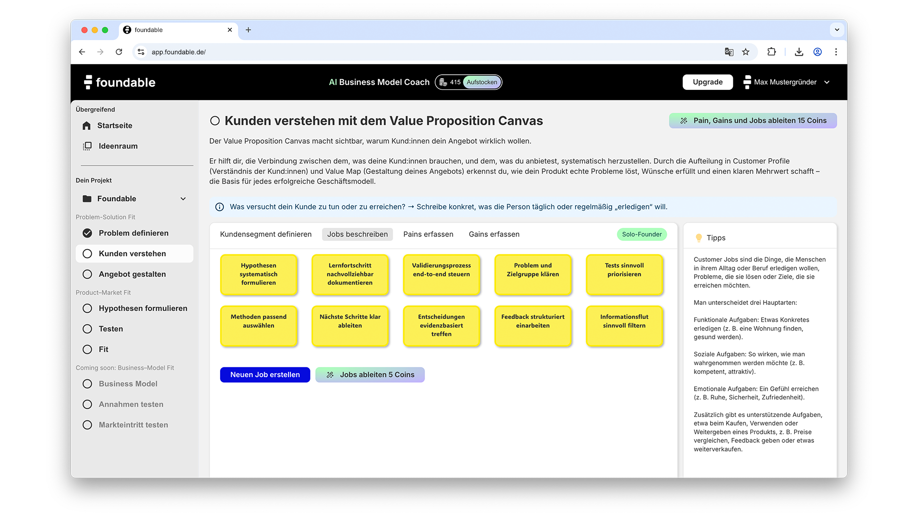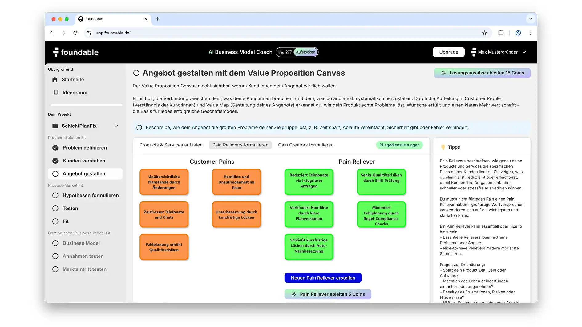 Übersetze Kundenprobleme in konkrete Produkte, Services, Pain Reliever und Gain Creator. Foundable zeigt dir, welche Bausteine wirklich zusammengehören.